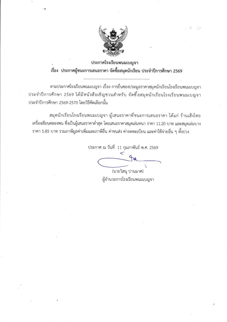 ประกาศผู้ชนะการเสนอราคา จัดซื้อสมุดนักเรียน ประจำปีการศึกษา 2569 โรงเรียนพนมเบญจา